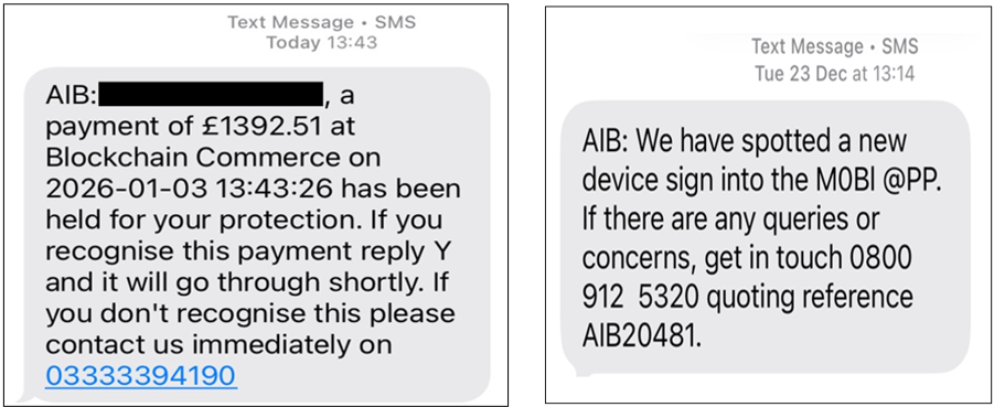 Fraudsters are targeting customers like you by sending text messages claiming to be AIB and/or other legitimate companies. These messages request you click a link to review or block a fraudulent transaction on your account or that you are locked out of your account. You will also be asked to input codes from your Card reader or divulge One Time Passcodes (OTP).